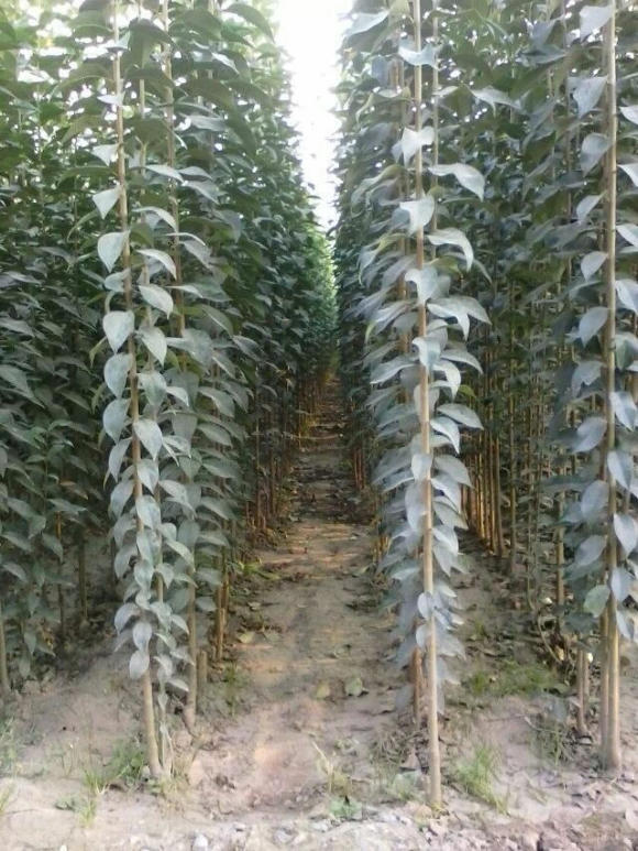 二、是定植修剪。定植前,對大苗中心主干的一年生延長枝短截1/3,剪口芽留強壯芽,同時要除去剪口下面第1對芽中的1個芽。以保證選留芽端優勢。為防止頂端產生競爭枝,對剪口下面第2~3對腋芽要進行破壞。位于中心主干下部、中部的其他枝條,要選留3~4個(以干高定)有一定間隔且相互錯落分布的枝條主枝。每個主枝要短截,留下芽,剝去上芽,以擴大樹冠,保持冠內通風透光。其余細弱枝可緩放不剪,以輔養主干生長。夏季修剪主要是短截中心主干上的競爭枝,不斷削弱其生長勢,同時剪除主干上和根部的萌蘗枝。第2年冬剪,仍要短截中心主干延長枝。但留芽方向與第1年相反。如遇中心主干上部發生競爭枝,要及時回縮或短截,以削弱生長勢。